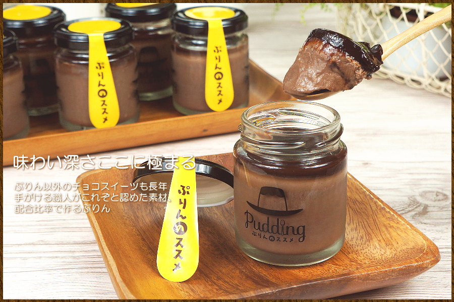 令和3年に、福岡県久留米市にオープンしたぷりん専門店「ぷりんのススメ」。こちらの店舗のこだわりが詰まったこの「りっちchocoぷりん」。カカオ含有量の違う3種類のチョコレートを、独自の配合で作り上げたチョコレートぷりん。とろっとした食感と濃厚で複雑なチョコレートの味わいが口いっぱいに広がっていきます。ややビターな味わいのチョコレート生地ですが、表面の甘めのソースと一緒に召し上がることでまた違った味わいもお楽しみいただけます。